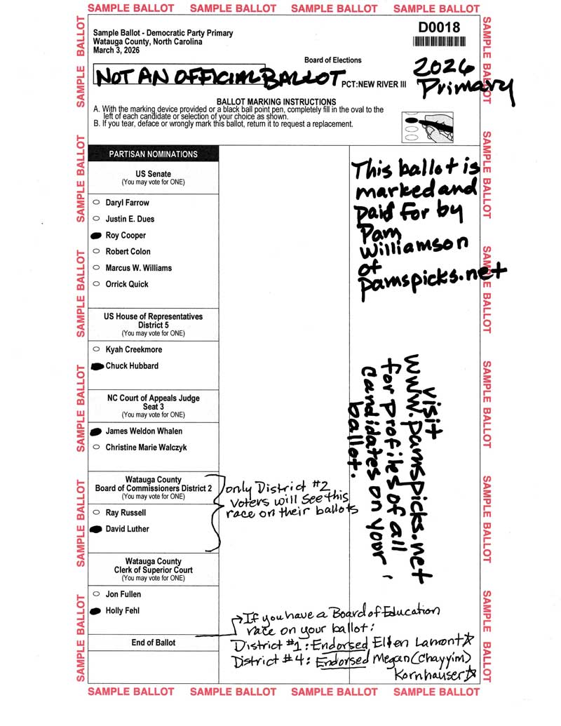 “Pam’s Picks” is simply one person’s opinion about the 2026 Primary Election Ballot. I am a progressive Watauga resident and have long held interest in local politics and issues. I am an activist for voting rights and environmental and community issues and generally endorse the candidate who most reflects and espouses my progressive ideology. Pam’s Picks endorsements may or may not reflect endorsements of a political party, but Pam’s Picks is independent of any political party.